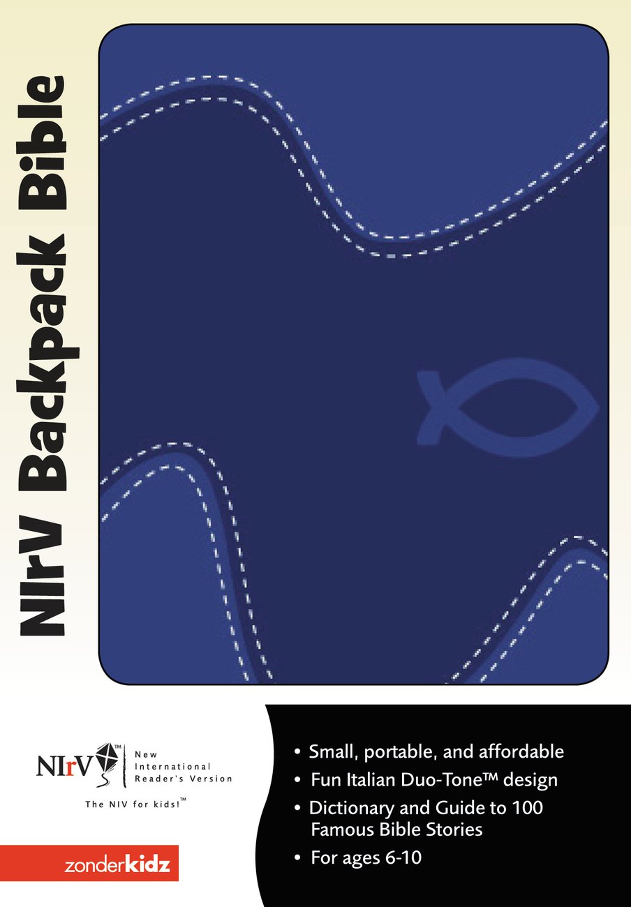 A cool NIrV Backpack Bible for Kids - ages 6-10. This compact Bibles contains the complete text of the New International Readers Version (NIrV - the NIV for kids!) in Italian Duo-Tone. Gift-boxed with a die-cut window to showcase the cover.