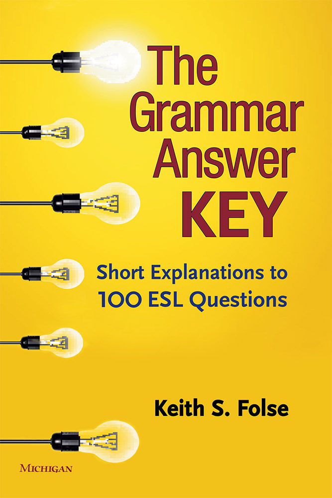 The Grammar Answer Key is a collection of 100 questions submitted by ESL teachers--both novice and experienced and both native and non-native speakers--from many different countries around the world. The questions are real questions that ESL/EFL students have asked teachers about English and are similar to the Hot Seat Questions presented in Keys to Teaching Grammar to English Language Learners, 2nd ed. (Folse, 2016). The 100 questions are organized into 12 chapters on topics that teachers and students can relate to well: adjectives, articles, clauses, connectors, gerunds and infinitives, prepositions, pronouns, pronunciation, subject-verb agreement, suffixes, verbs, and vocabulary-grammar connections. The number of questions in each chapter ranges from 3 to 13 and is based on the questions submitted. Each chapter begins with a short overview of the topic that features key terminology and a chart explaining three common ESL errors. Each question is presented in a box and is followed by an "answer" that can inform instruction, often in chart format. Examples of questions are: How do you know if a word is an adjective? Can I say the Monday or the January? Do you say on July or in July? I received an email from someone that said “Greetings from my wife and I.” Is this right? Why? How do I know which way to pronounce the -ed at the end of a word? Which verb tenses are the most common in English? Which ones should I study? Why do you say turn on the light instead of turn the light? In my language, we have one word for make and do. In English, when should I use make and when should I use do? The book is the ideal teacher resource and professional development tool.