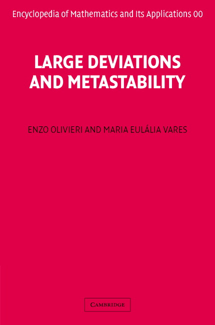 Preface; 1. Large deviations: basic results; 2. Small random perturbations of dynamical systems: basic estimates of Freidlin and Wentzell; 3. Large deviations and statistical mechanics; 4. Metastability I: general description, the Curie-Weiss model and contact processes; 5. Metastability II: the models of Freidlin and Wentzell; 6. Reversible Markov chains in the Freidlin-Wentzell regime; 7. Metastable behaviour for lattice spin models at low temperature; Bibliography; Index.