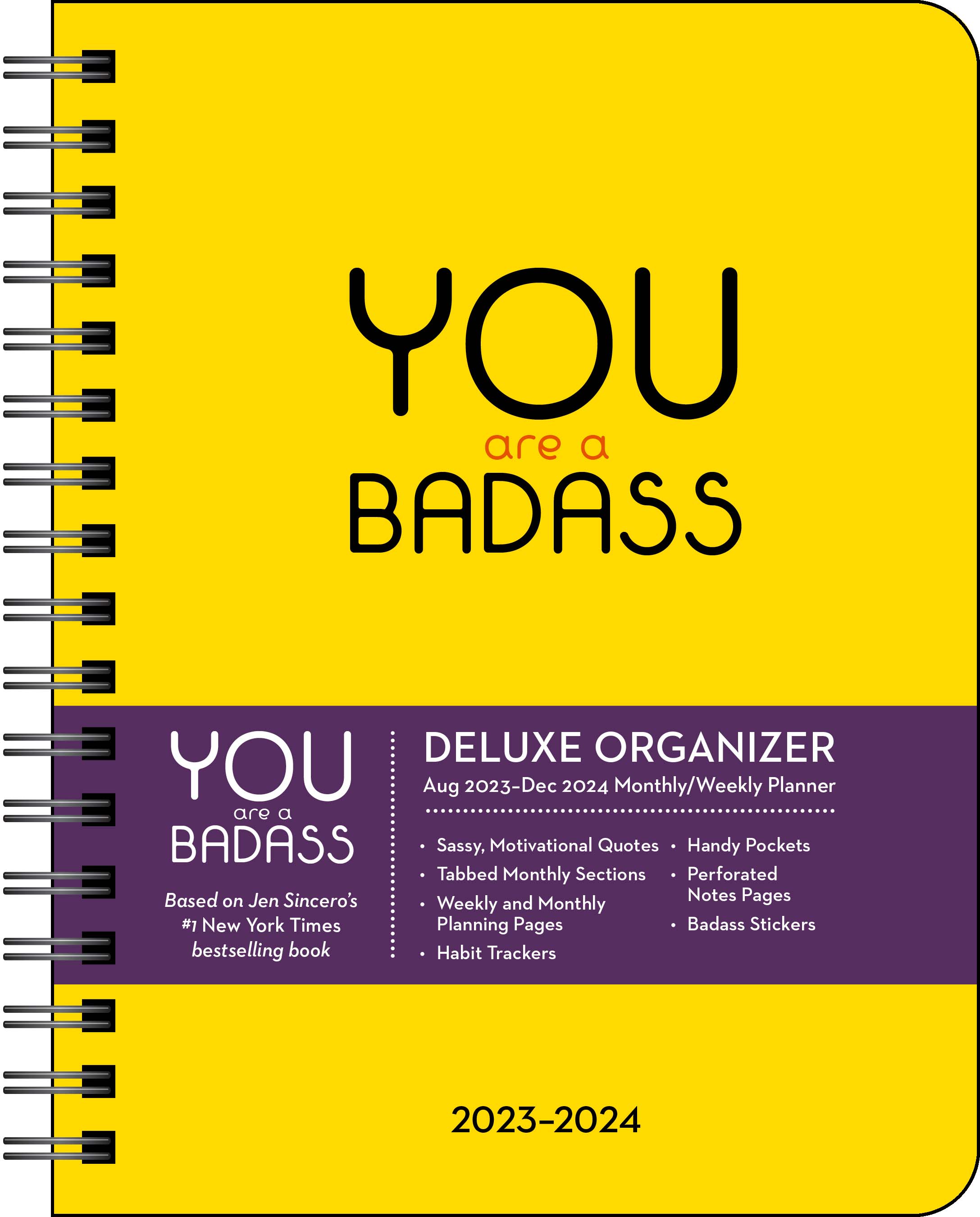 Weekly and monthly planning spreads cheer you on with sometimes swear-y motivations as you schedule events, manage daily to-do lists, and reach your goals. The inspirational quotes are from #1 New York Times bestselling author Jen Sincero’s books: You Are a Badass, You Are a Badass at Making Money, You Are a Badass Every Day, and Badass Habits.   Features Include: 7" x 9" trim size (14" x 9" open) Spiral bound Hardcover with soft-touch finish and black foil lettering Printed on FSC certified paper with soy-based ink Removable product info tab Elastic band to keep it closed Calendar lays flat when open 17-month planner: August 2023–December 2024 Two-page monthly spreads Two-page weekly spreads with daily vertical to-do lists and ready-to-check to-do boxes Monthly habit trackers Generous grid space for notes, appointments, and reminders Extra pages at back for notes, goals, and more Year-at-a-glance pages for 2023, 2024, and 2025 Reinforced monthly tabs Two sticker sheets with badass inspirations Two pockets for storage Three sheets of 3" x 3" perforated squares to tear out for lists, notes, etc. Official major world holidays and observances Moon phases, based on Universal Time Badass inspiration on every calendar spread